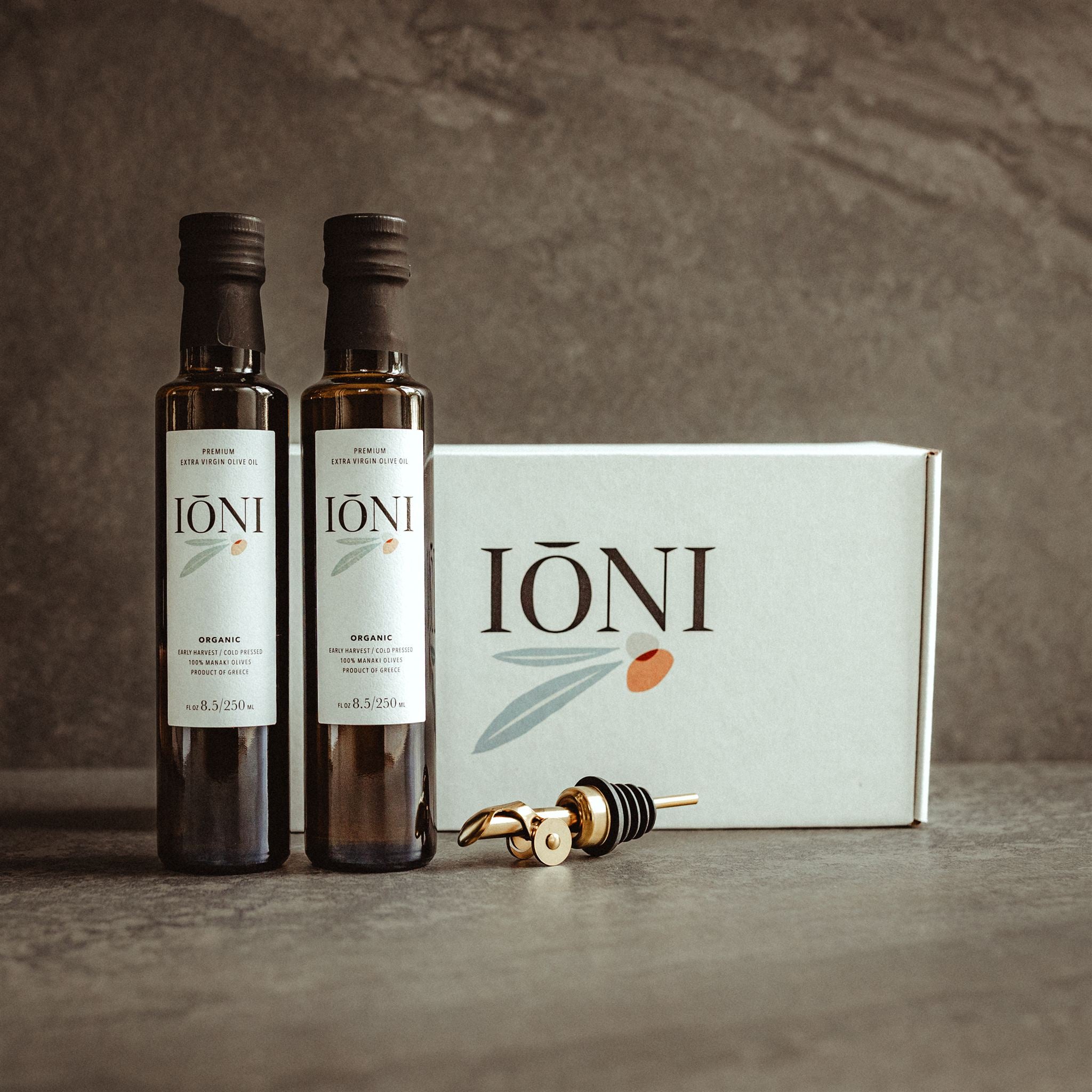 Share the essence of Greece with the IONI Gift Set: Contains two 250ml bottles of our certified organic extra virgin olive oil and spout, thoughtfully packaged for those who appreciate exceptional taste and timeless gifting.